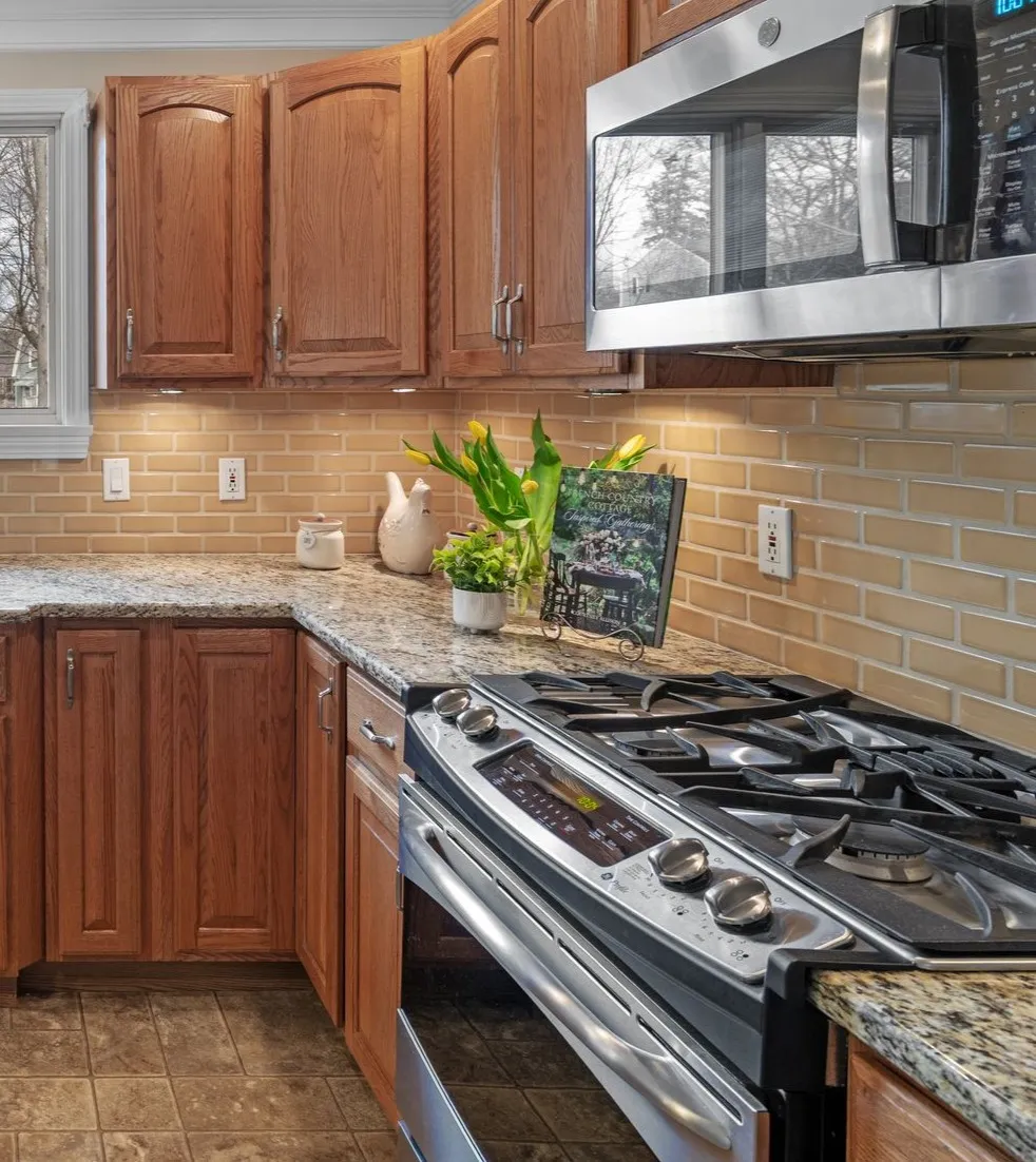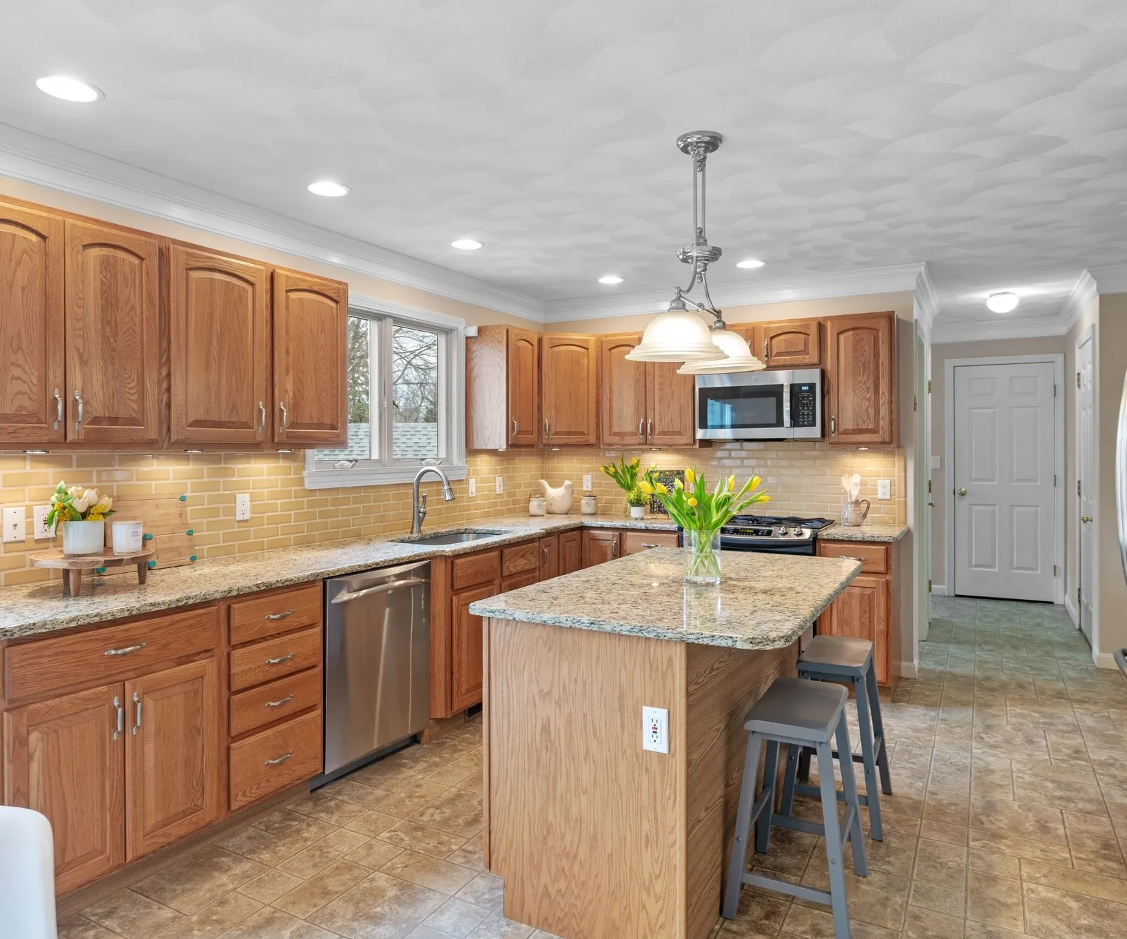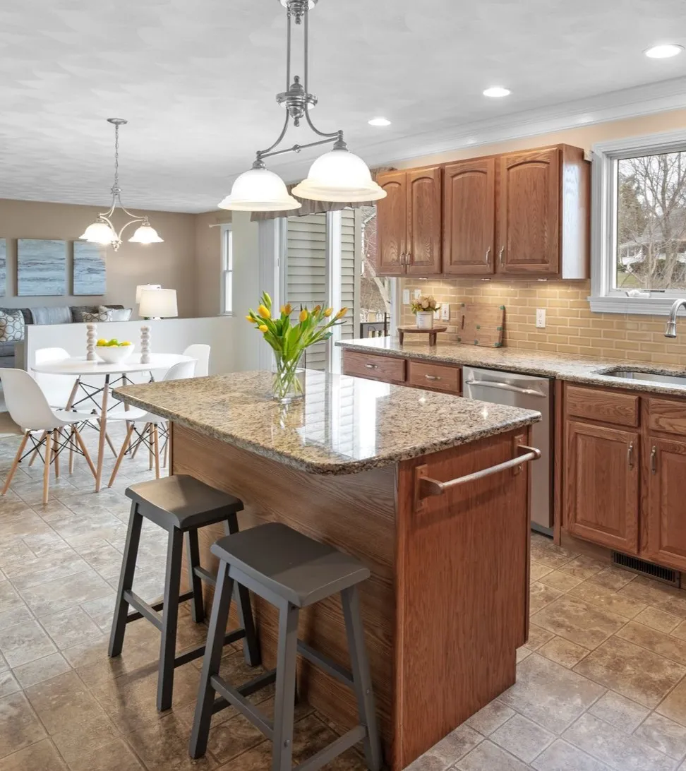 Stretching across the back of the house, the family room is the space where everyone naturally gathers. Large windows overlook the backyard while the fireplace anchors the room, creating a comfortable place for movies, reading, and time spent together.