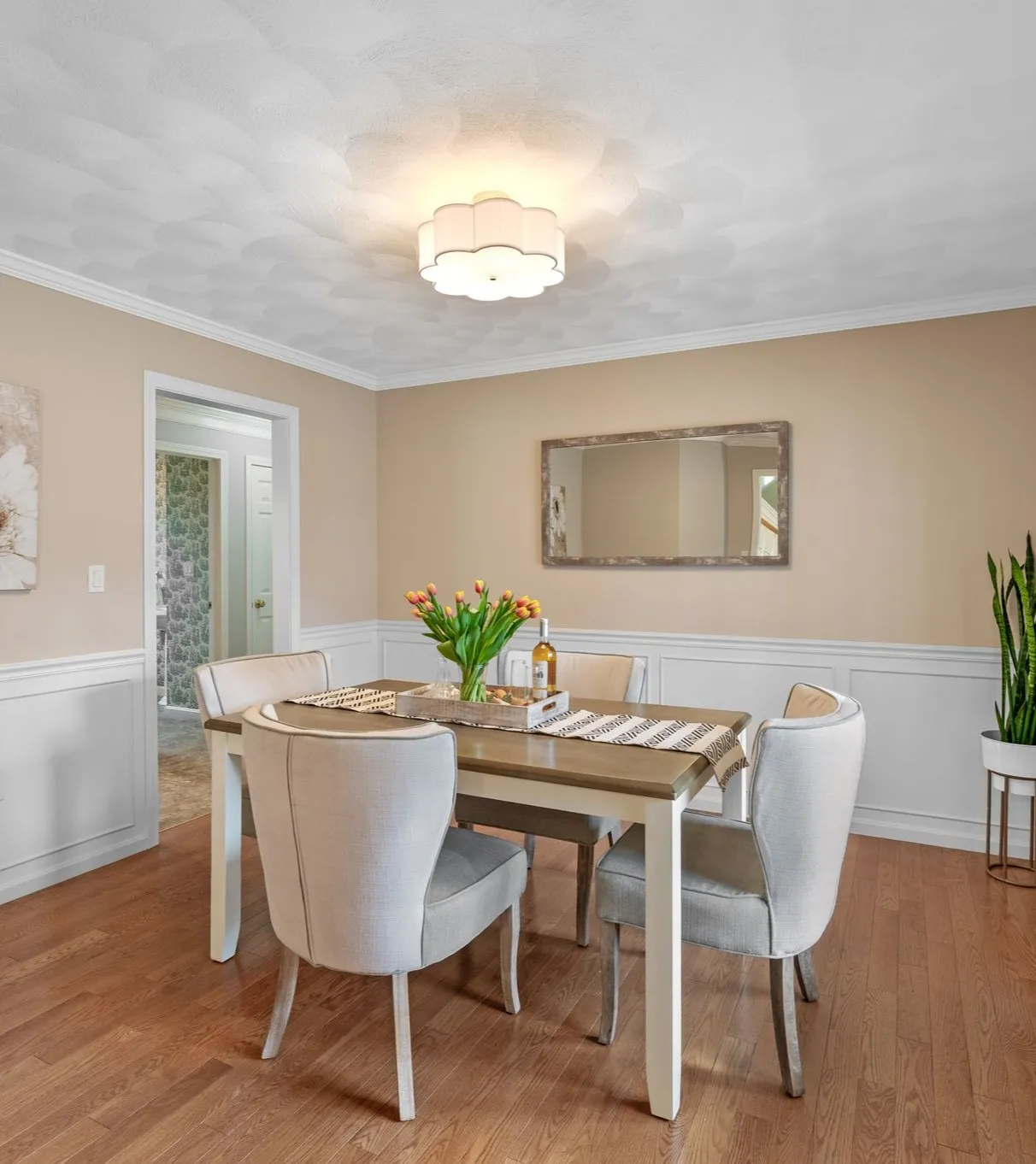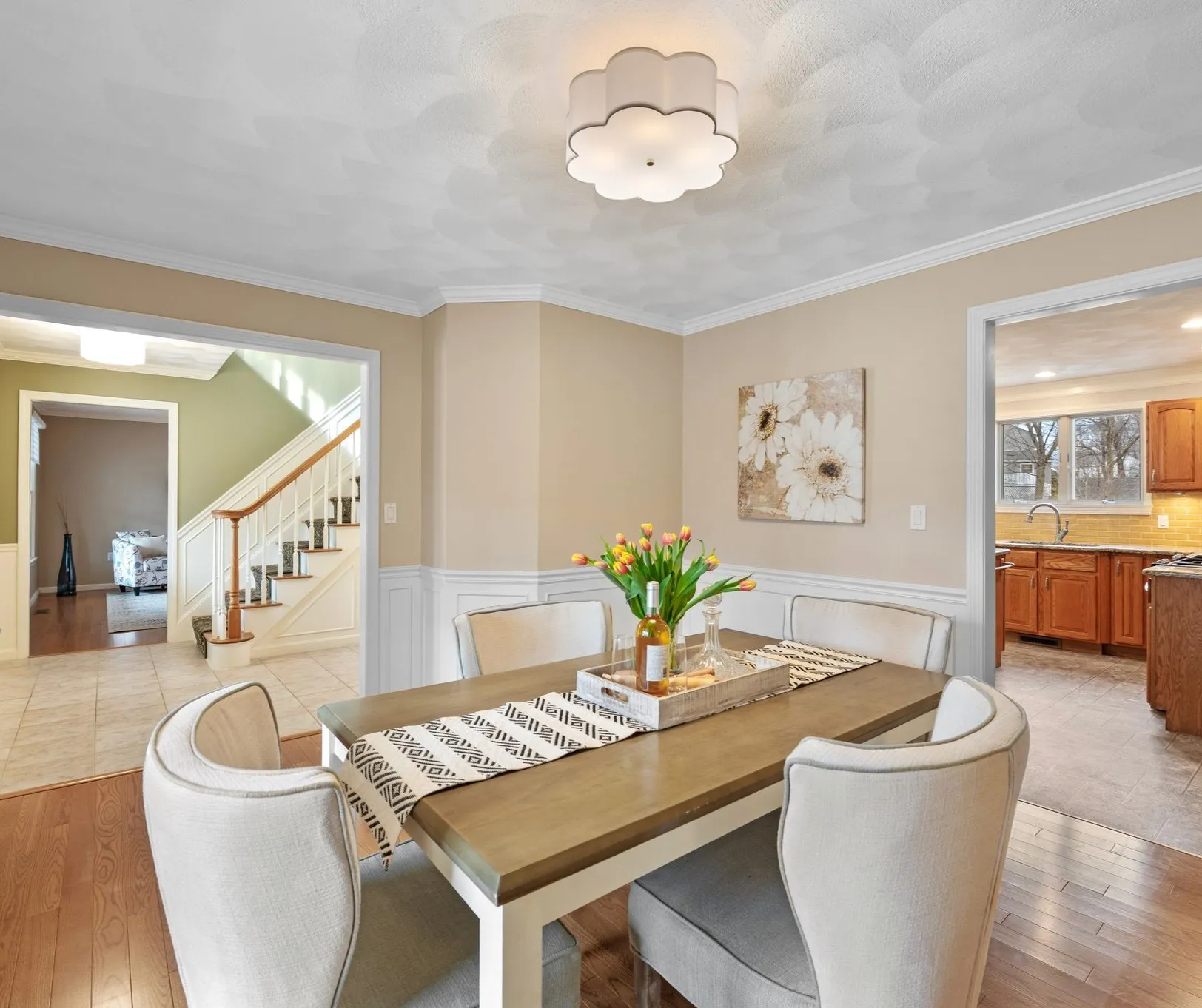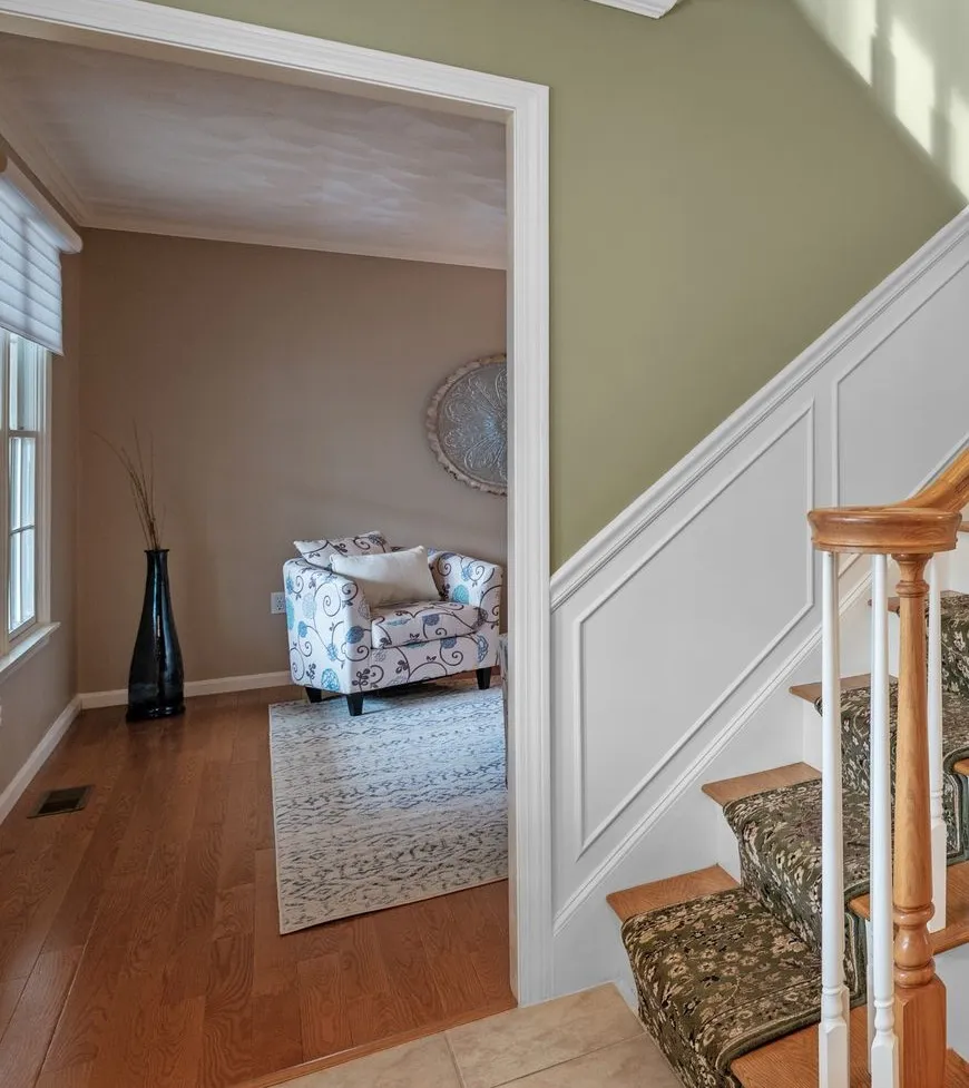 The dining room sits between the living spaces and kitchen, making it a natural place for everyday meals and larger gatherings. Nearby, the powder room and dedicated laundry room are conveniently located on the main floor, adding practical function to the layout without interrupting the flow of the home.