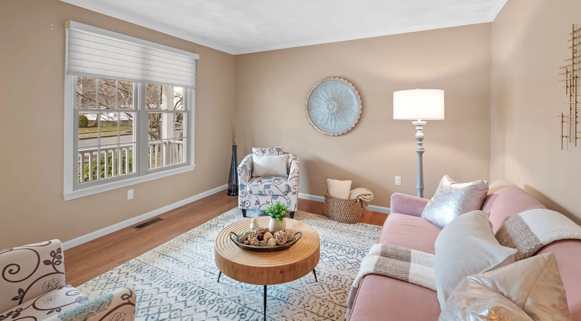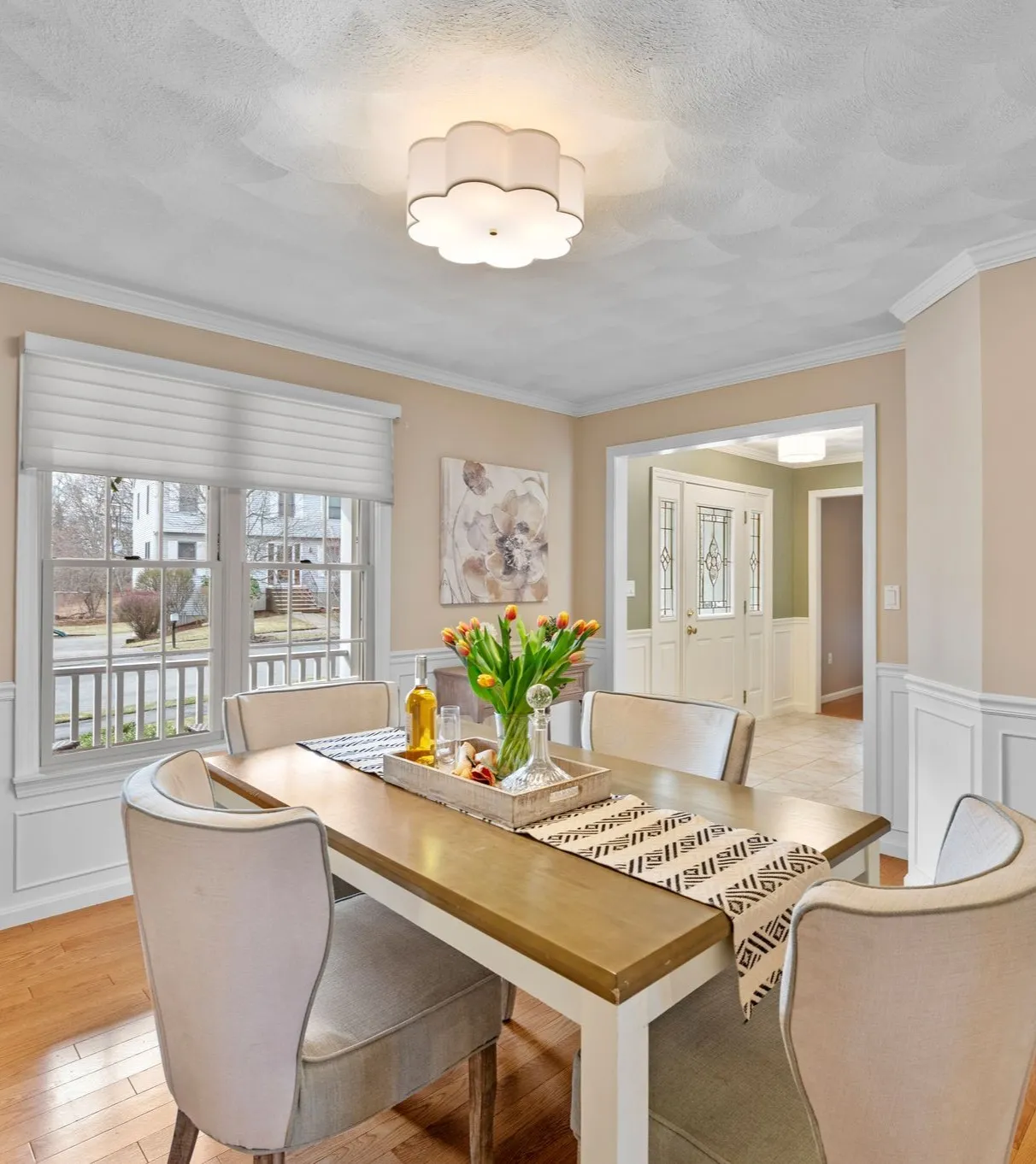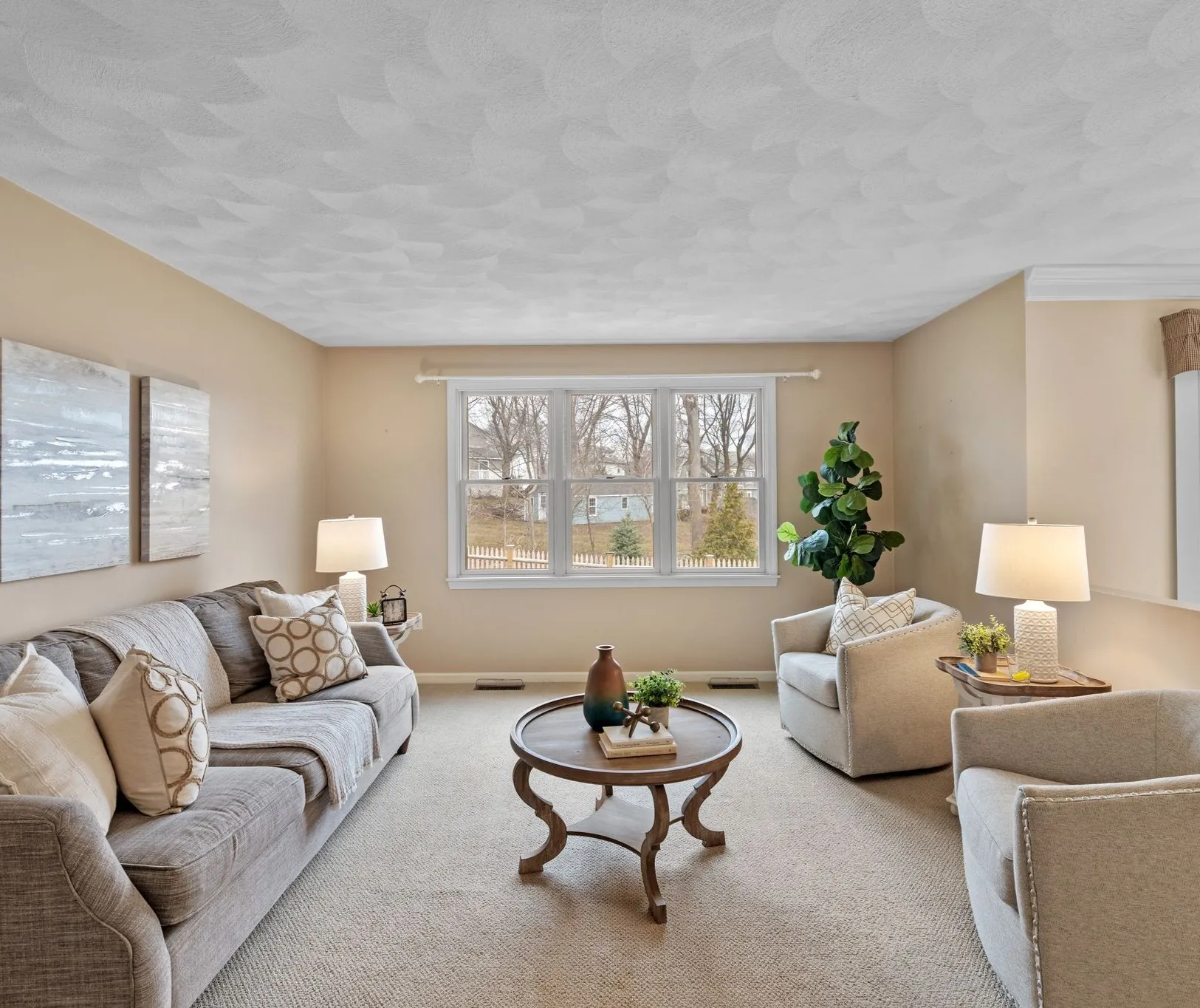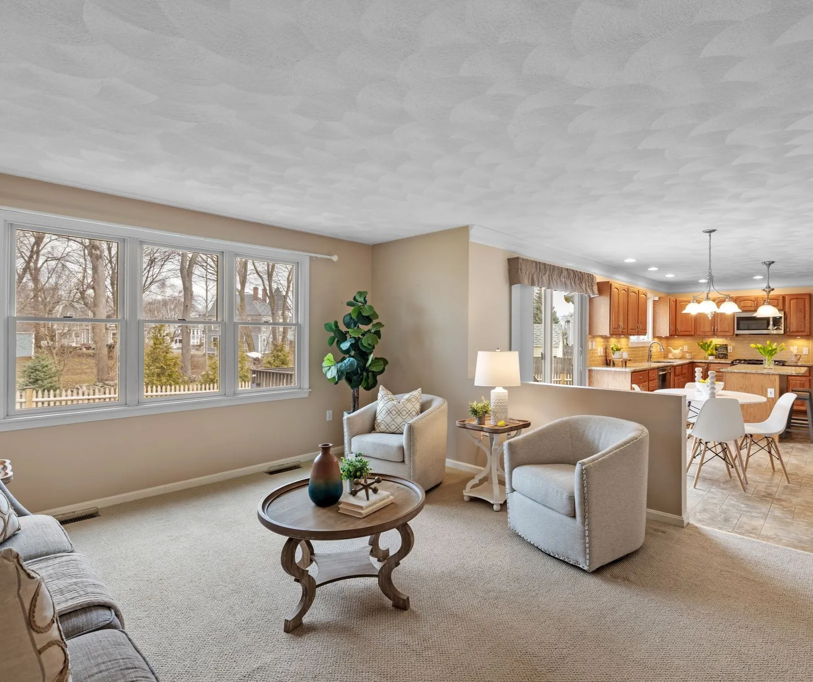 Inside, a bright entry opens directly to the living room — a quieter space at the front of the house with a wide window and enough separation from the rest of the home, making this a comfortable everyday space for reading, visiting, or a quieter place to relax