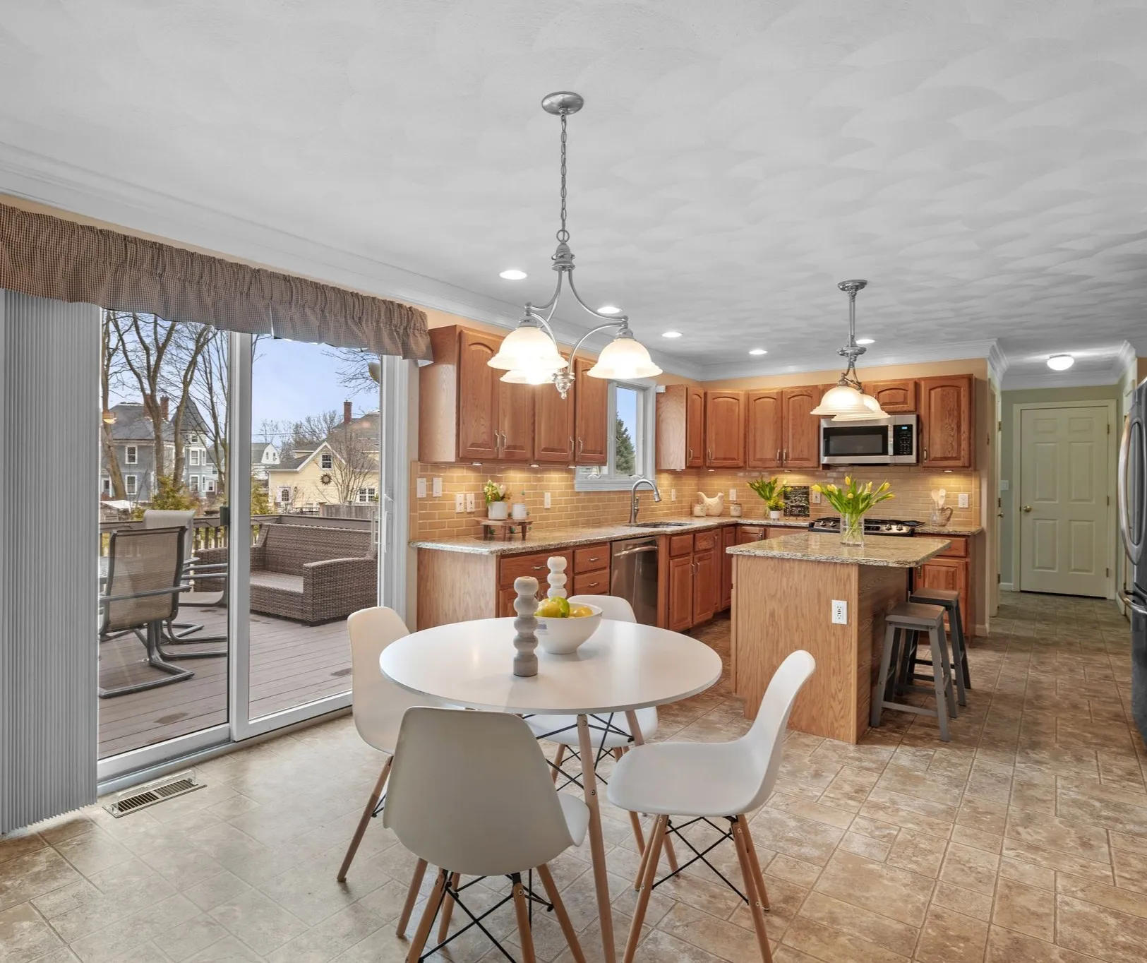 The kitchen sits at the center of the home with extensive cabinetry, granite counters, and a large island for cooking and gathering. Just beside it, the breakfast nook overlooks the deck and backyard, creating an easy everyday dining space with direct access outside.