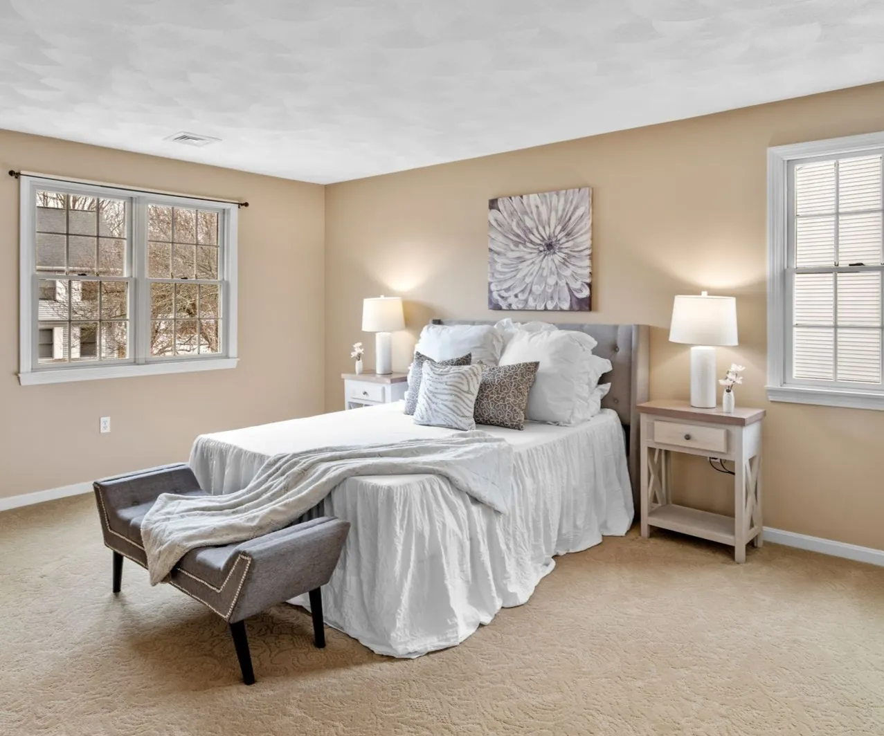 The primary bedroom is spacious and bright, with enough room for both a sleeping area and a sitting area. A walk-in closet and large ensuite bathroom with double vanity, soaking tub, and separate shower complete the suite and give the space a private, comfortable feel.