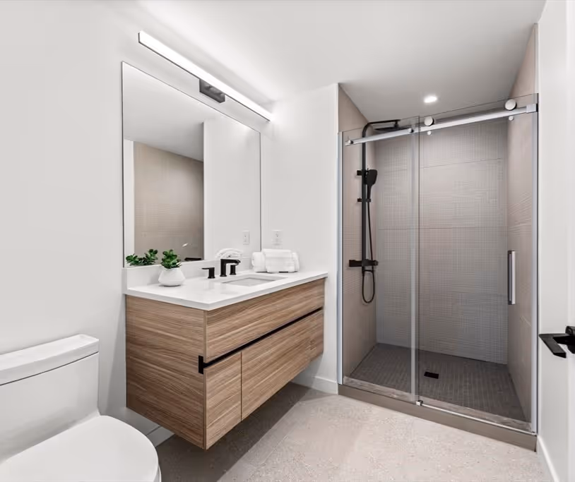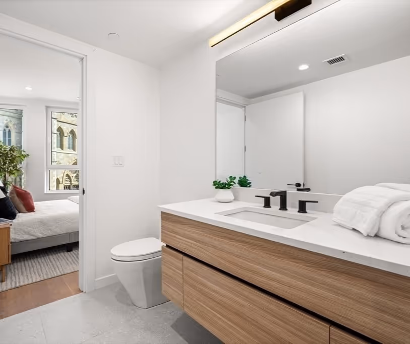 The primary suite reflects the balance of softness and structure found throughout The EL. Framed by views of cathedral stone and sky, the bedroom leads to a serene ensuite with floating wood vanity, matte black fixtures, and a walk-in shower—calm, quiet, and built to last.