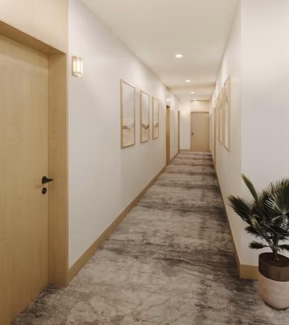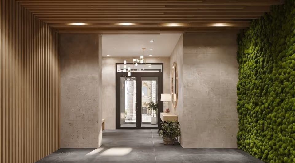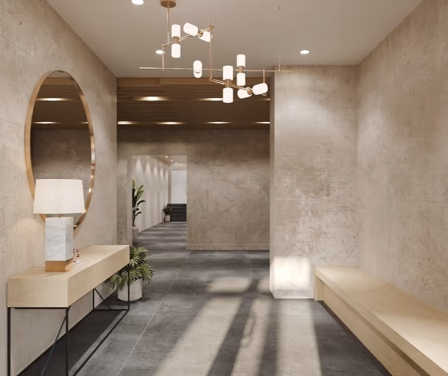 A contemporary interpretation of South End architecture, The EL’s façade integrates clean lines with historic context. Inside, the palette softens—natural textures, sculptural lighting, and a living green wall lend warmth to the lobby’s minimal design. Every arrival is considered, from street-level to the elevator’s quiet ascent.